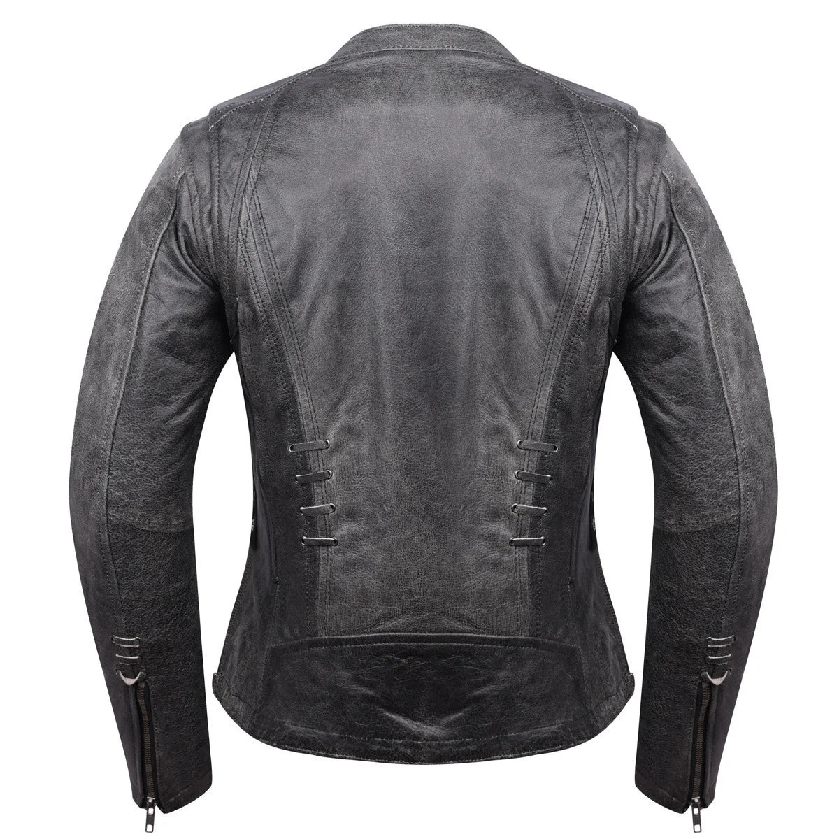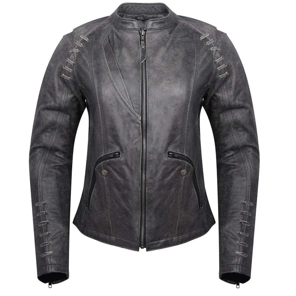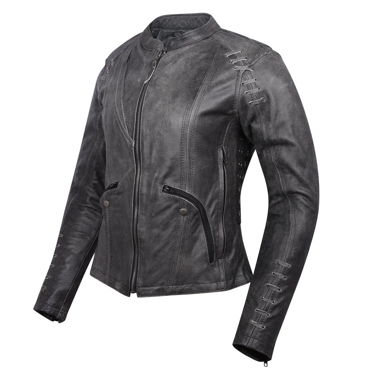 High Mileage HML638DG Women’s Lace and Grommet Detail Distressed Gray Goat Skin Leather Lady Biker Motorcycle Fashion Jacket.