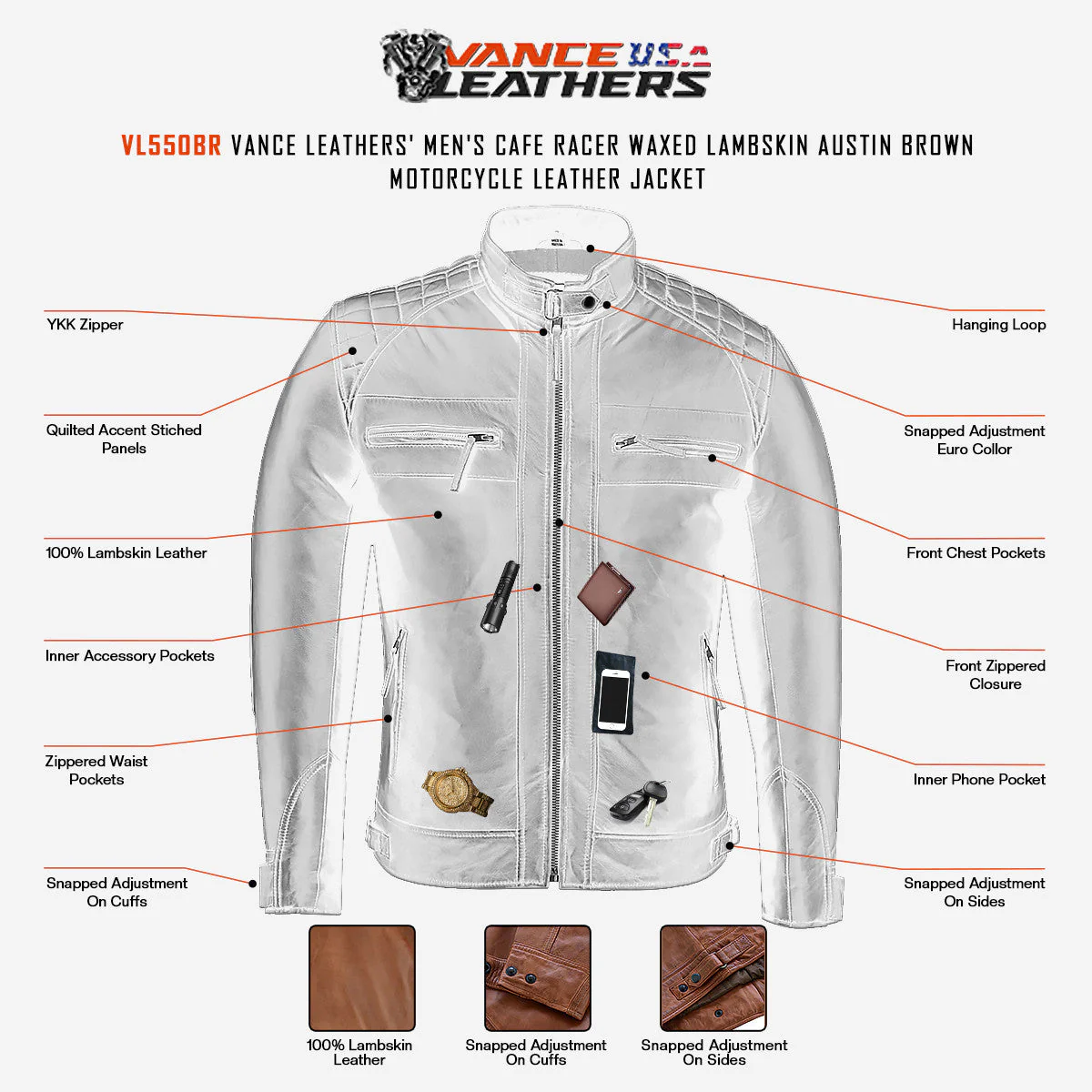 - 100% Lambskin LEATHER: is made of 100% Lambskin Leather to provide the best quality of leather to our community. With the elaborate design, exquisite workmanship, and high-quality Waxed Lambskin Austin Brown leather, Vance Leather provides more functional and fashionable jackets for men.